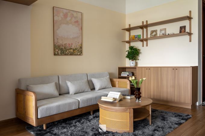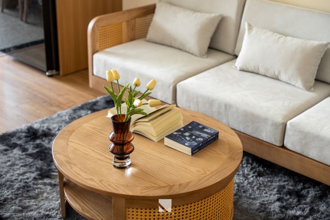 Ghế sofa không to nhưng đủ sâu để ngồi cuộn chân đọc sách, bàn trà có lọ hoa nhỏ – rất “tĩnh”.