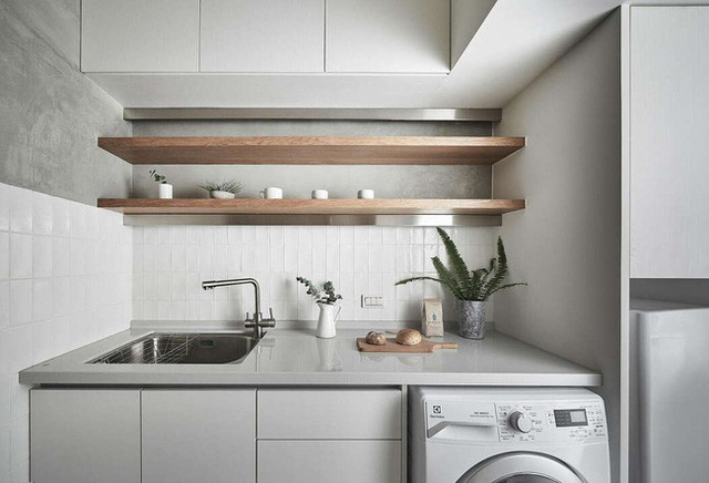 Khu vực nhà bếp với khu lưu trữ có thể chứa thêm máy giặt.