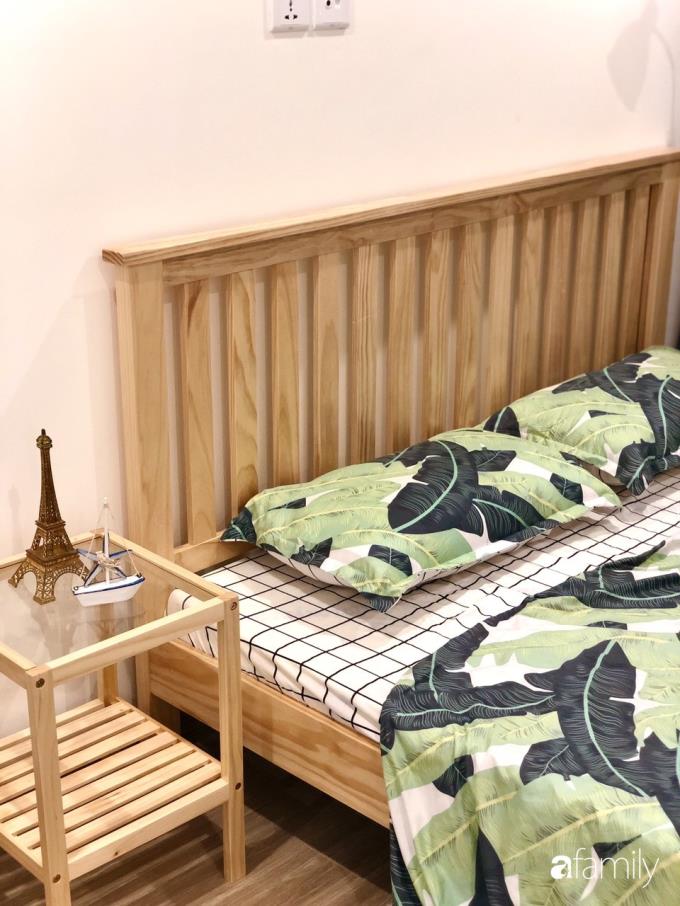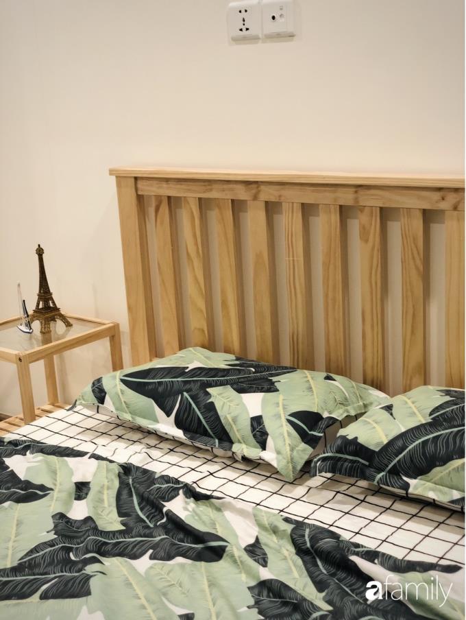 Bộ chăn ga với họa tiết màu xanh lá tạo nét ấn tượng đặc biệt cho căn phòng.