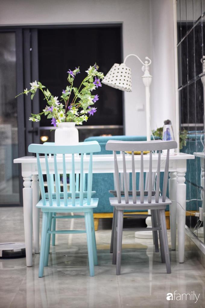 Khu vực ăn uống với những chiếc ghế sắc màu giúp không gian thêm vui tươi, ấn tượng.