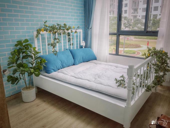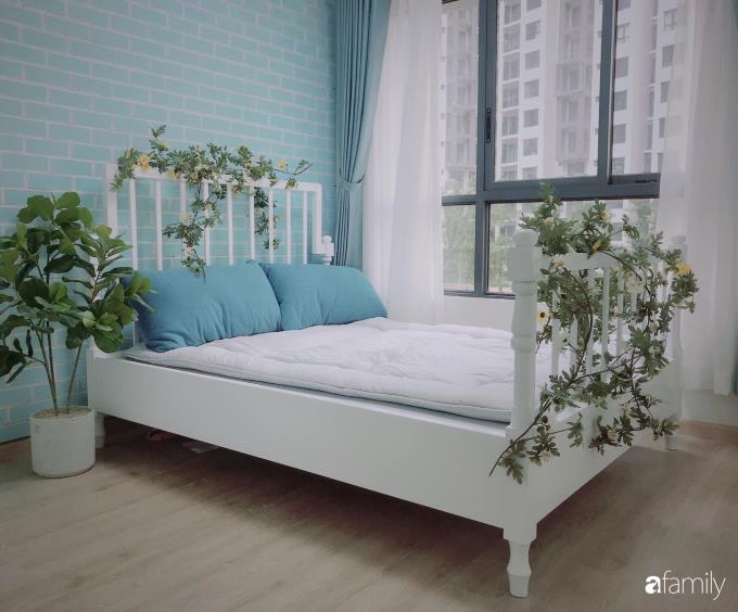 Điểm tô trên chiếc giường trắng là những cành hoa cúc rủ tạo vẻ đẹp ngọt ngào và lãng mạn cho không gian nghỉ ngơi. Cách lựa chọn màu sắc đơn giản, nội thất gọn gàng giúp không gian thêm rộng và thoáng hơn nhiều so với diện tích thực.