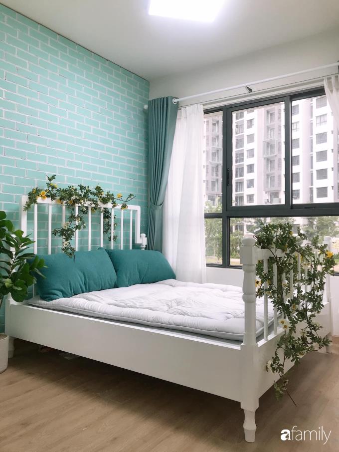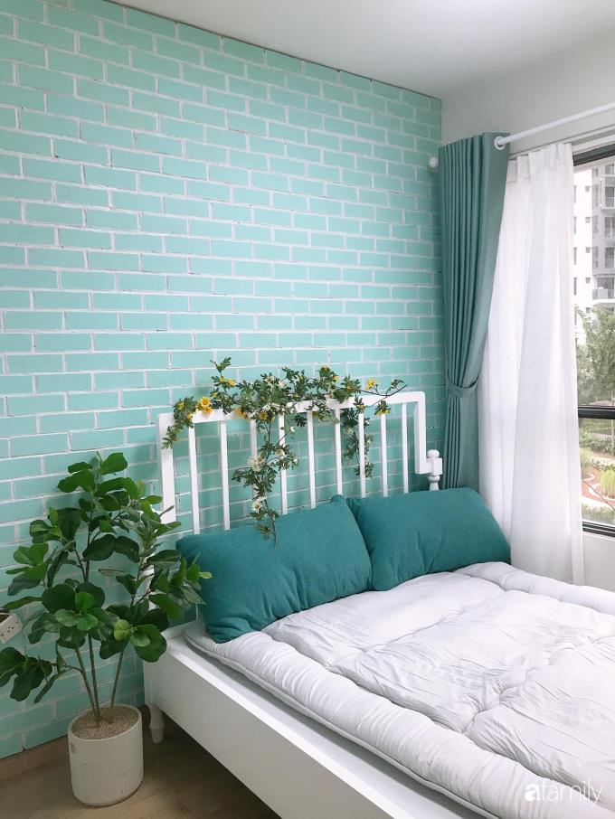 Chị Anna Anh thích căn hộ của mình có một góc nào đó như quán cà phê. Đi uống cà phê, chị rất thích nhìn ngắm những bức tường gạch hoài cổ. Chị Anna Anh quyết định ốp gạch một vách tường phòng ngủ. Cũng vì quá yêu màu xanh bạc hà nên bức tường đó đã được chị lựa chọn với gam màu này.