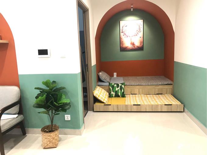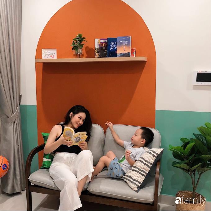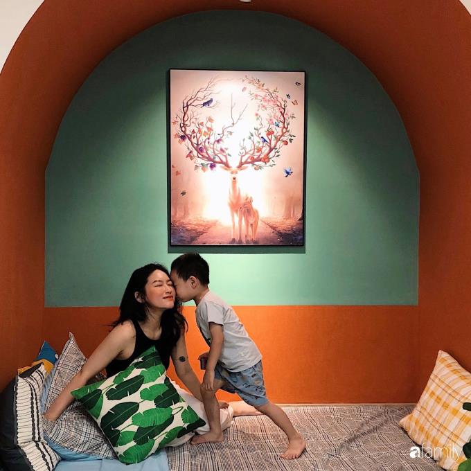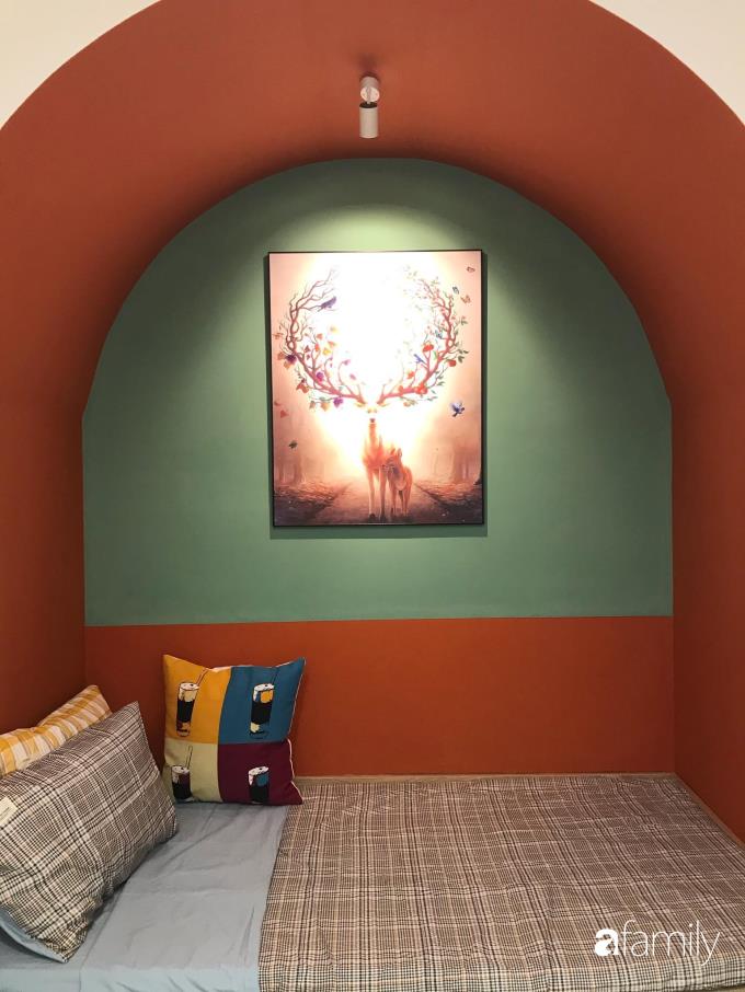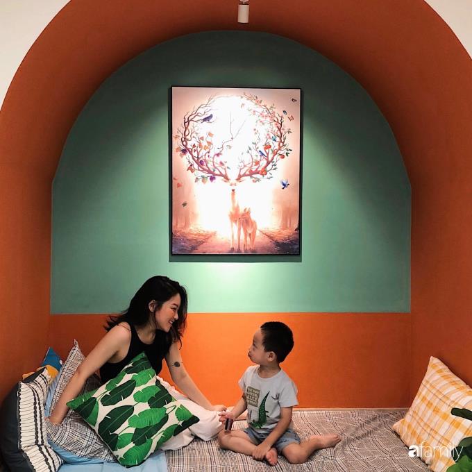 Khu vực không gian phụ được KTS đưa ý tưởng làm vòm thạch cao bên trên, phía dưới là chiếc giường đơn thông minh, kéo bên dưới ra sẽ trở thành hai chiếc giường thoải mái cho 2 người nằm. Kéo vào thì trở thành chỗ khách có thể ngồi chơi, hoặc nằm nghỉ buổi trưa. Góc nhỏ này cũng có thể là nơi đọc sách, trò chuyện với mọi người trong gia đình. Chị Hương cho biết, con trai chị rất mê góc nhỏ xinh xắn này.
