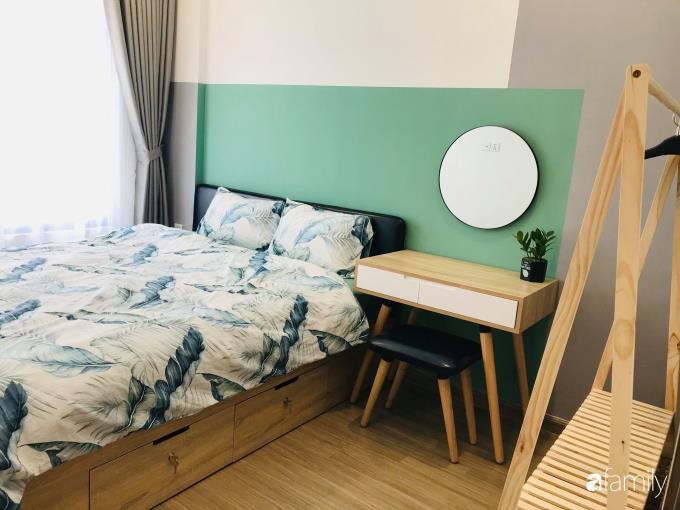 Khu vực phòng ngủ được thiết kế 4 ngăn kéo dưới giường để đựng đồ thay vì làm tủ như thông thường. Chị còn mua thêm chiếc giá treo quần áo tiện lợi, một bàn trang điểm nhỏ xinh.