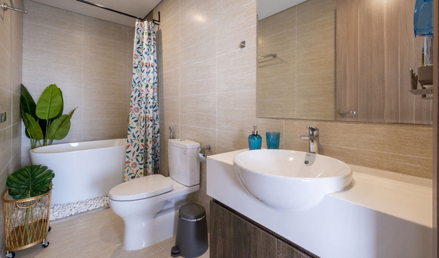 Phòng tắm với rèm họa tiết và cây xanh mang lại sự dễ chịu vào cuối ngày làm việc.