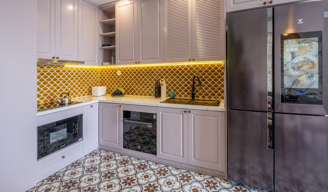 Khu vực bếp được sử dụng gạch men hoài cổ kết hợp ánh sáng và hệ tủ hiện đại mang đến sự pha trộn hợp lý, phù hợp với phong cách chung của căn hộ.