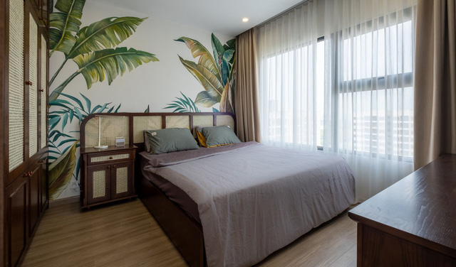 Phòng ngủ master nhẹ nhàng với đường nét Indochine đặc thù cùng vật liệu gỗ kết hợp mây tre. Bức tranh tường lớn đậm chất Tropical cũng được sử dụng giúp căn phòng thêm dễ chịu.