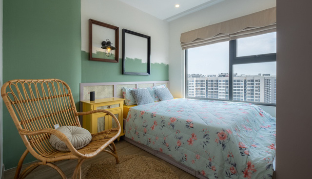 Phòng ngủ phụ có diện tích nhỏ nên giường nối liền tủ quần áo. Căn phòng được khéo léo sử dụng tông chủ đạo là màu xanh kết hợp vàng ở chiếc tab đầu giường làm điểm nhấn.
