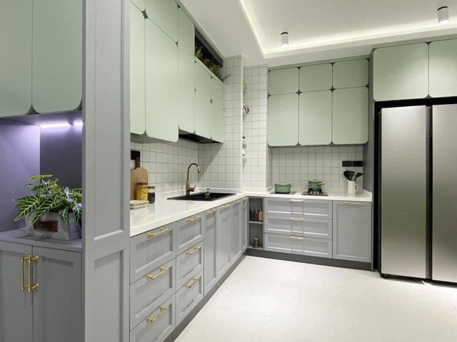 Phía trong là không gian nấu nướng, tủ bếp hình chữ L rất phù hợp với phong cách hiện đại. Những cánh cửa tủ bếp treo tường bằng các hình vuông và chữ nhật đan xen nhau, tạo sự độc đáo, ấn tượng. Bên cạnh đó, mỗi ngăn tủ đều có cánh cửa mang lại sự gọn gàng ngăn nắp. Toàn bộ không gian phòng bếp sử dụng hai màu chính đó là màu trắng và màu xanh, đây là hai gam màu tạo sự nhẹ nhàng, sạch sẽ và mát mắt.