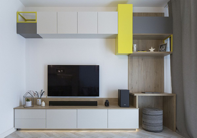 Ghế sofa xanh dương, tủ tường màu vàng và những chiếc rèm cửa màu xám cho phòng khách hiện đại màu trắng.