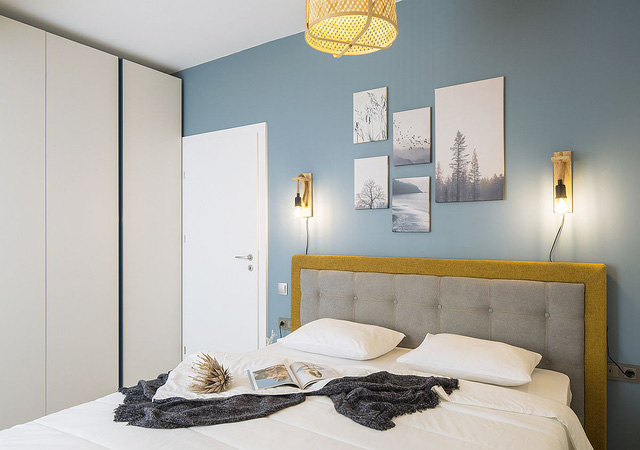 Sự pha trộn màu sắc ấn tượng với 3 gam màu: Xanh dương, vàng và xám trong một căn hộ