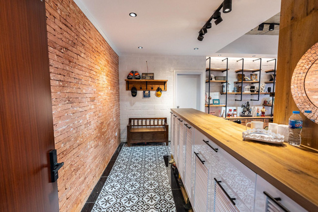 'Vợ chồng tôi cùng hoạt động trong lĩnh vực sáng tạo. Bởi vậy, chúng tôi mong muốn căn hộ mang đậm dấu ấn riêng của bản thân. Khi toàn quyết thiết kế, bố trí công năng, hoàn thiện căn hộ theo sở thích, chúng tôi vô cùng háo hức, thích thú, thêm yêu tổ ấm của mình hơn', chị chia sẻ. Khu vực sảnh cửa vào có hệ tủ giày 3 khoang, kết hợp cùng giá xoay để giày 360 độ, đủ sức chứa hết giày của cả nhà. Khách tới chơi có thể để hết giày dép trong nhà, không phải để ở hành lang. Ngoài ra nơi này còn có ghế đi giày, giá treo mũ phục vụ sở thích sưu tập mũ của chị Khánh.