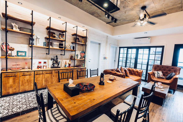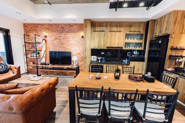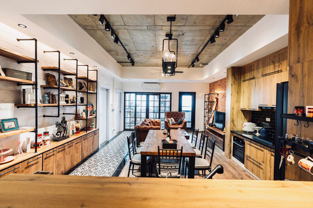 Phong cách chung của ngôi nhà là industrial (công nghiệp) pha chút rustic (mộc mạc). Điều này được thể hiện qua sự kết hợp giữa trần bê tông thô với gỗ tự nhiên, gỗ công nghiệp và sắt. Một điểm nhấn khác của căn hộ là hệ thống ánh sáng điểm spotlight, các đèn rọi ray downlight, đồ trang trí tạo nên không gian thoải mái, ấm cúng.
