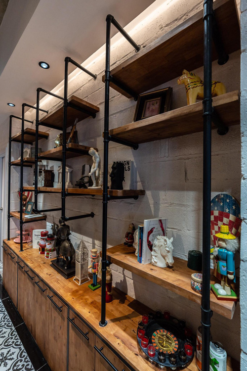 Ngoài ra, căn hộ còn có hệ giá kệ ống nước mang phong cách công nghiệp để đựng đồ trang trí, đồ gia dụng khác.