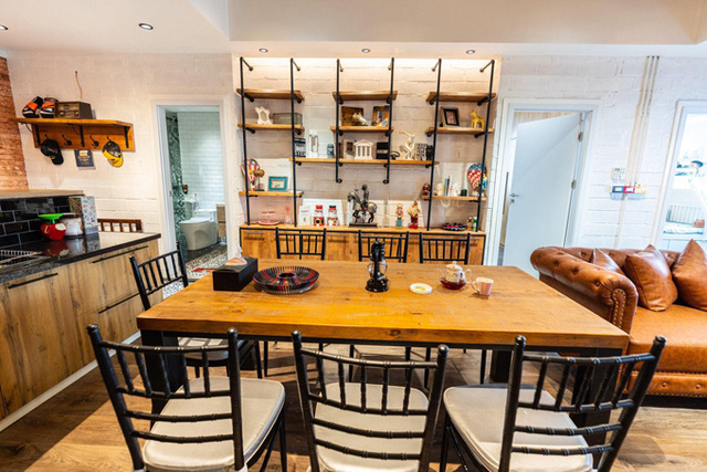 Tâm điểm là chiếc bàn ăn làm từ gỗ thông Australia, đủ chỗ cho 10-12 người khi nhà có khách.
